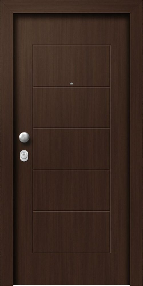 Πόρτα ασφαλείας λούστρο με εσωτερική επένδυση επίπεδη σε χρώμα επιλογής σας και εξωτερική επένδυση λούστρο Νο5-WENGE με σχέδιο πρεσαριστό Κ110.