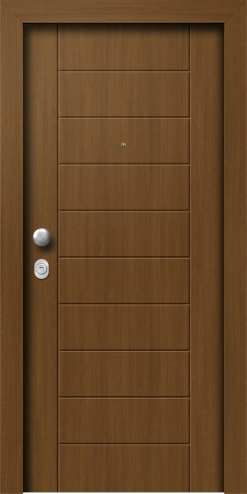Πόρτα ασφαλείας λούστρο με εσωτερική επένδυση επίπεδη σε χρώμα επιλογής σας και εξωτερική επένδυση λούστρο Νο2-ΜΕΣΑΙΟ με σχέδιο πρεσαριστό Κ112.