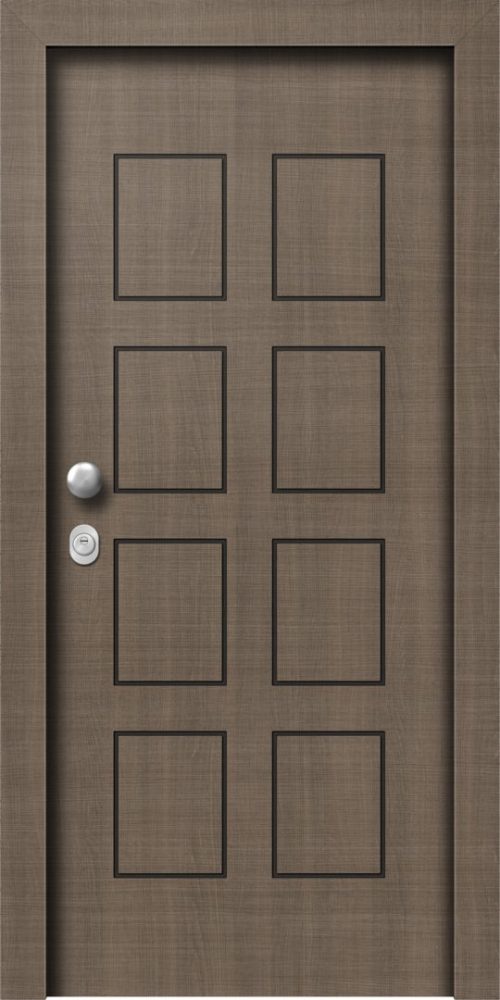 Πόρτα ασφαλείας laminate με εσωτερική επένδυση επίπεδη σε χρώμα επιλογής σας και εξωτερική επένδυση LAMINATE MARRON με σχέδιο L823.